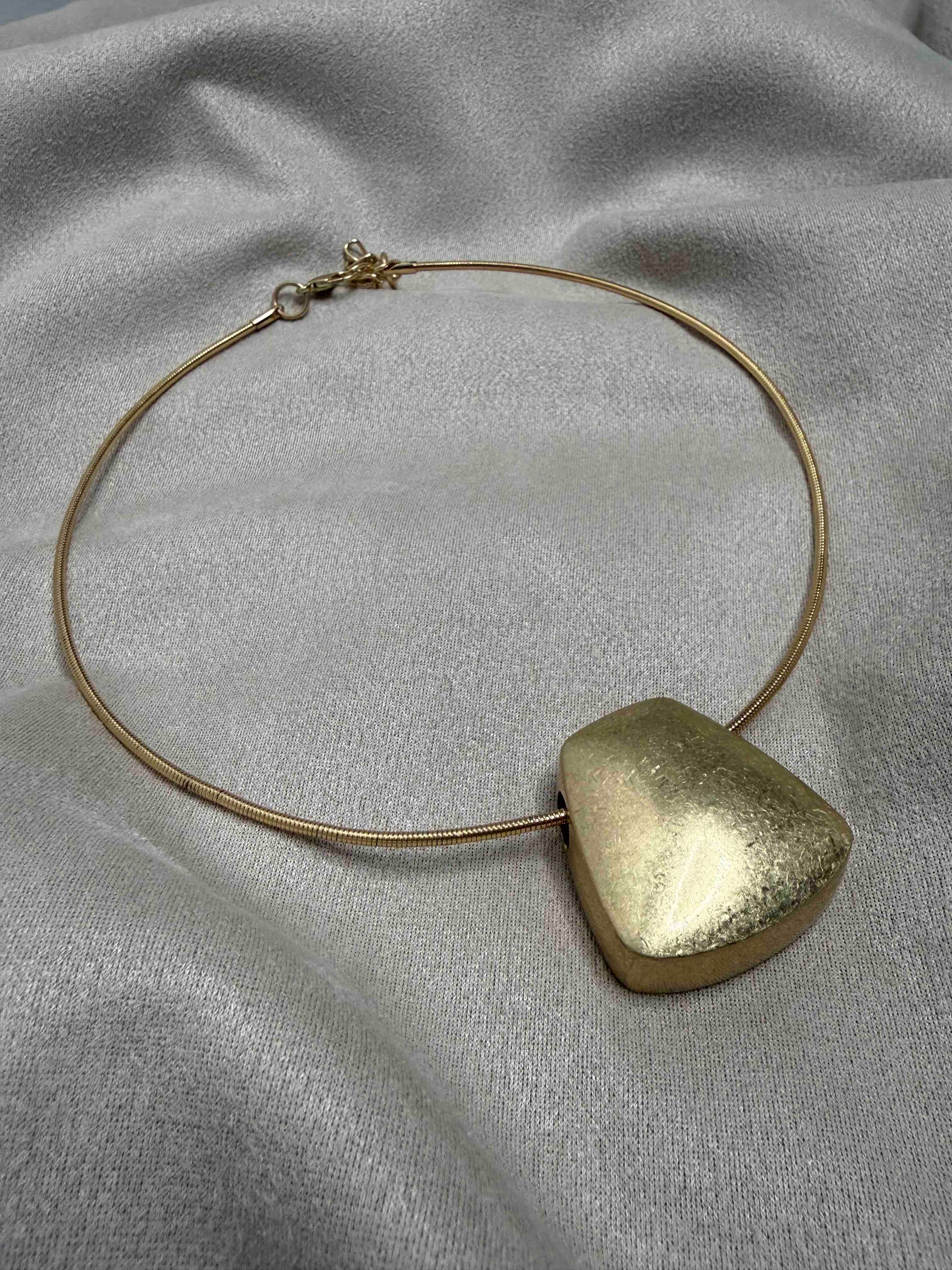 Minimal κολιέ σε χρυσό τόνο με άκαμπτη βάση και ματ μεταλλικό στοιχείο σε οργανικό σχήμα, ιδανικό για κάθε στιγμή της ημέρας.